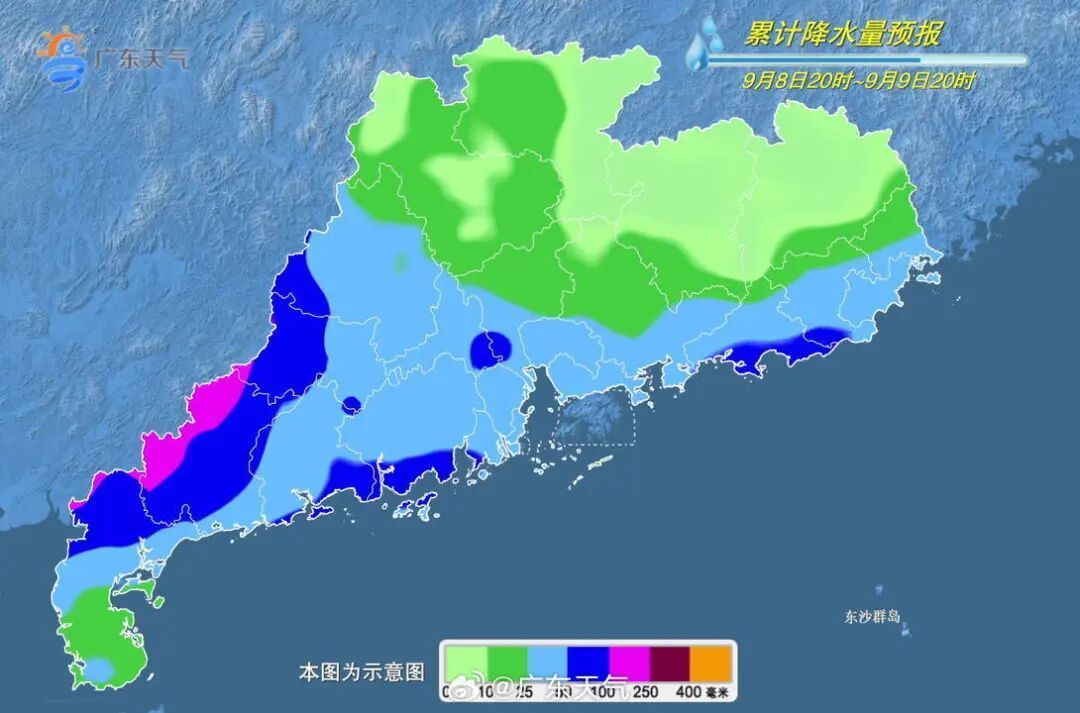 8-9日,珠三角南部和粤西市县有暴雨到大暴雨局部特大暴雨,粤东市县有大雨到暴雨局部大暴雨,其余市县有(雷)阵雨局部暴雨。最高气温:粤北市县32~34℃,其余市县28~32℃。